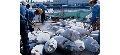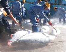 はえ縄漁で漁獲し、船上凍結されたまぐろを港で仕分けします。