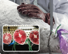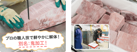 冷凍されたまま、次々と加工して、一気に梱包~出荷まで行い、鮮度を守ります。船上凍結から一度も解凍せずに、スシローの店舗まで届けます。