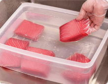 海水と同じ濃度の塩水で解凍することで旨味を逃しません。